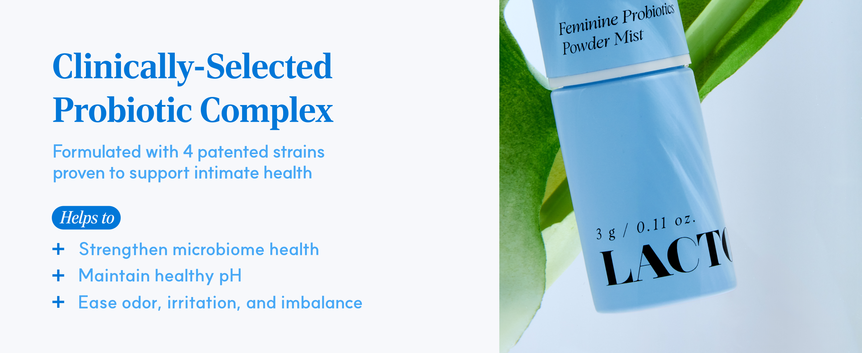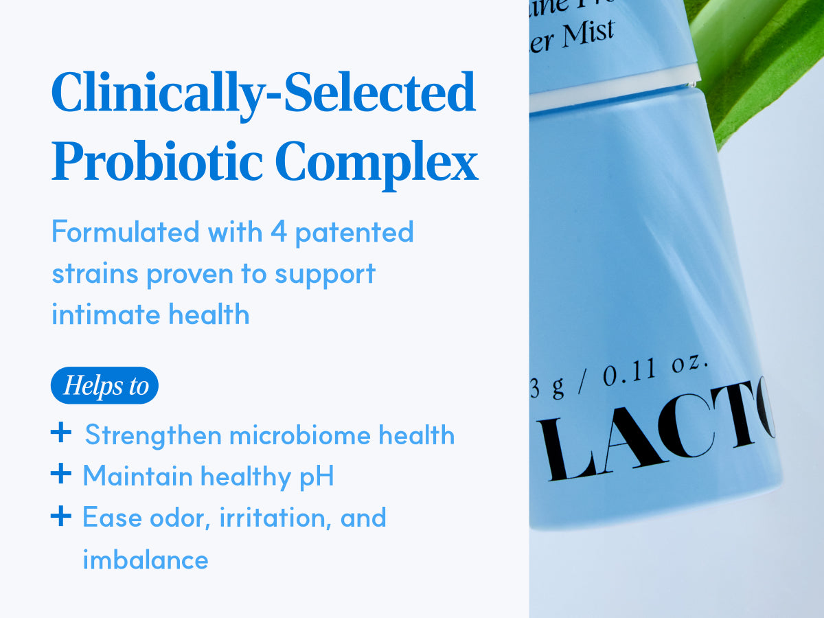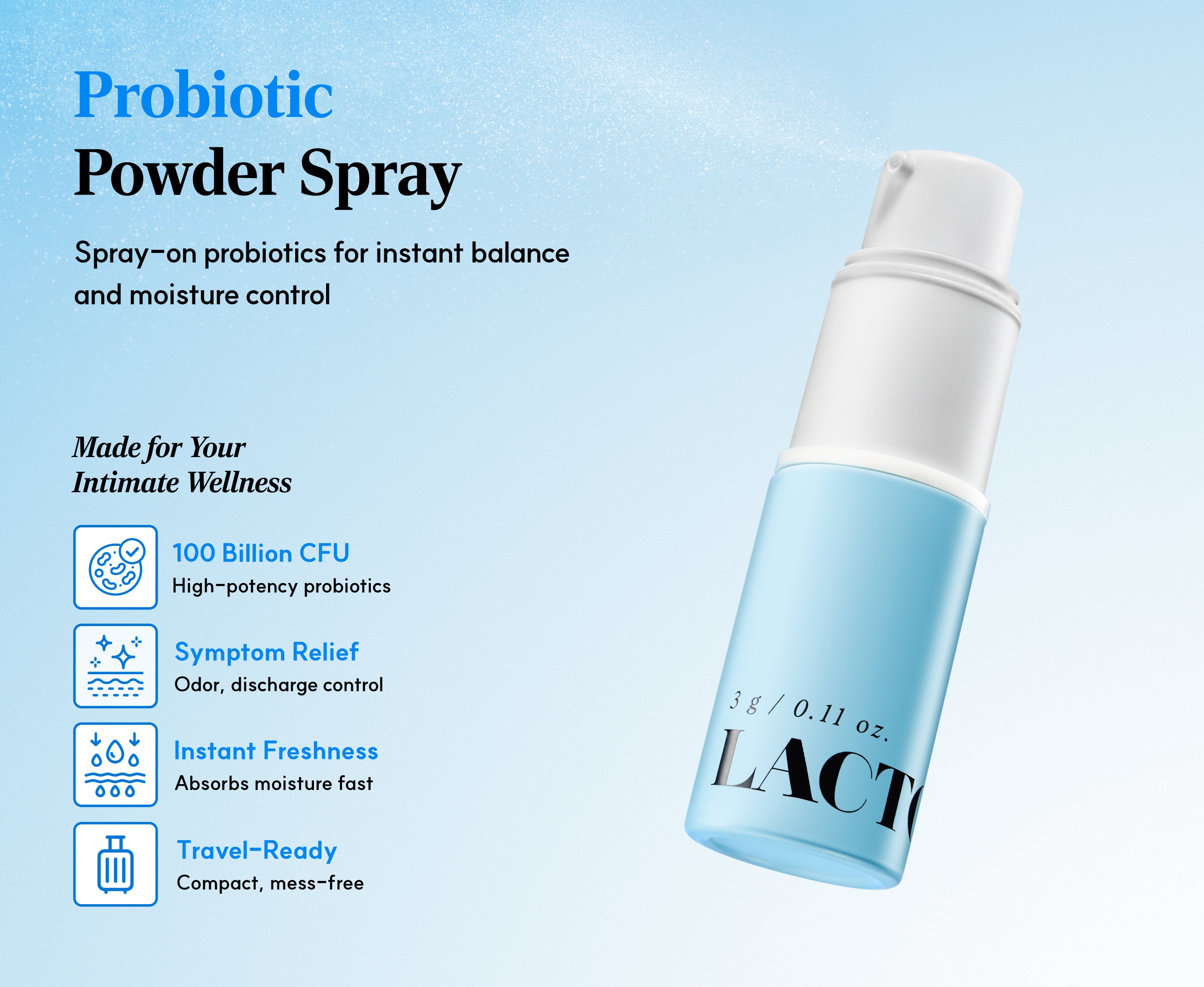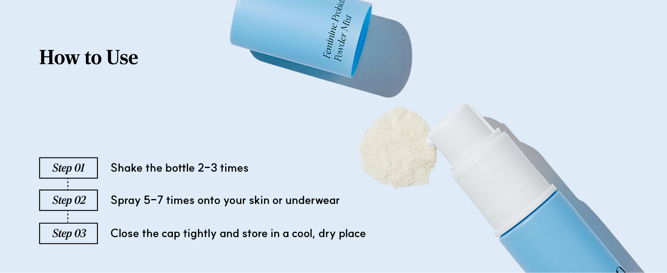 Highly concentrated pre + probiotic powder mist for moisture control and natural balance.