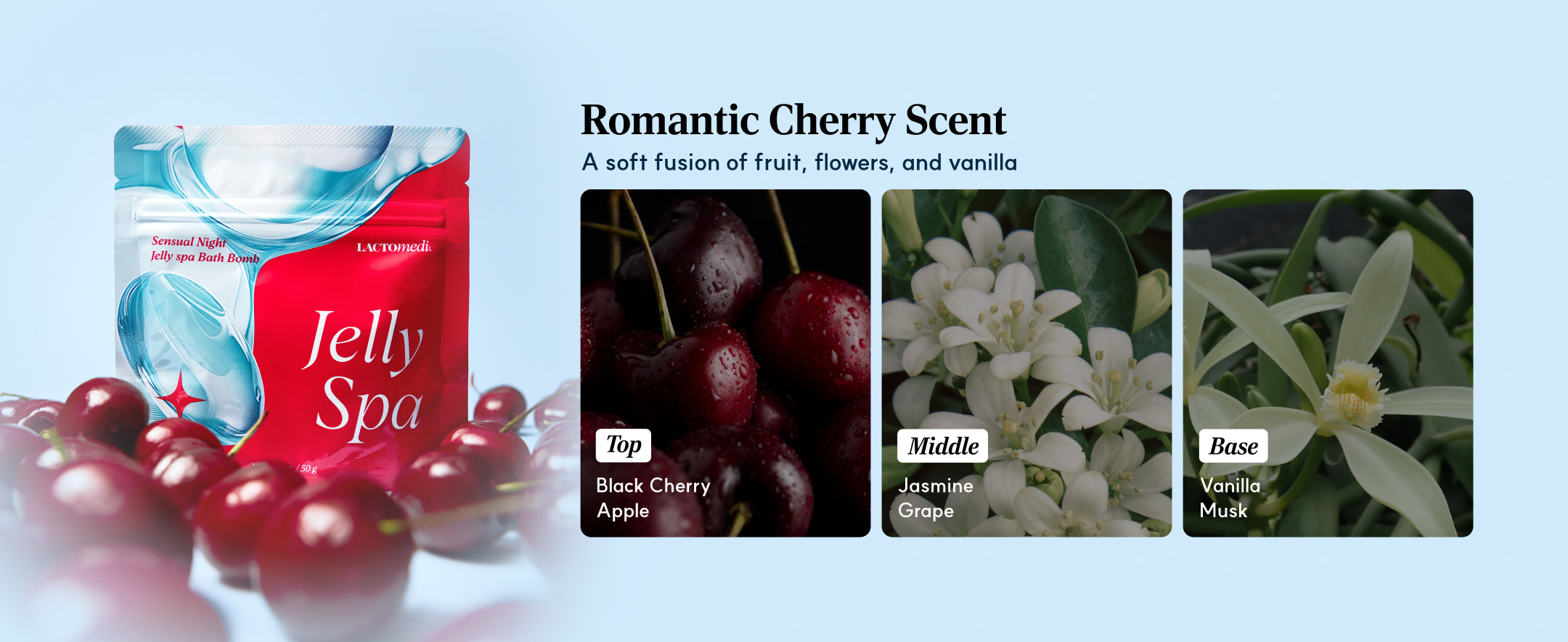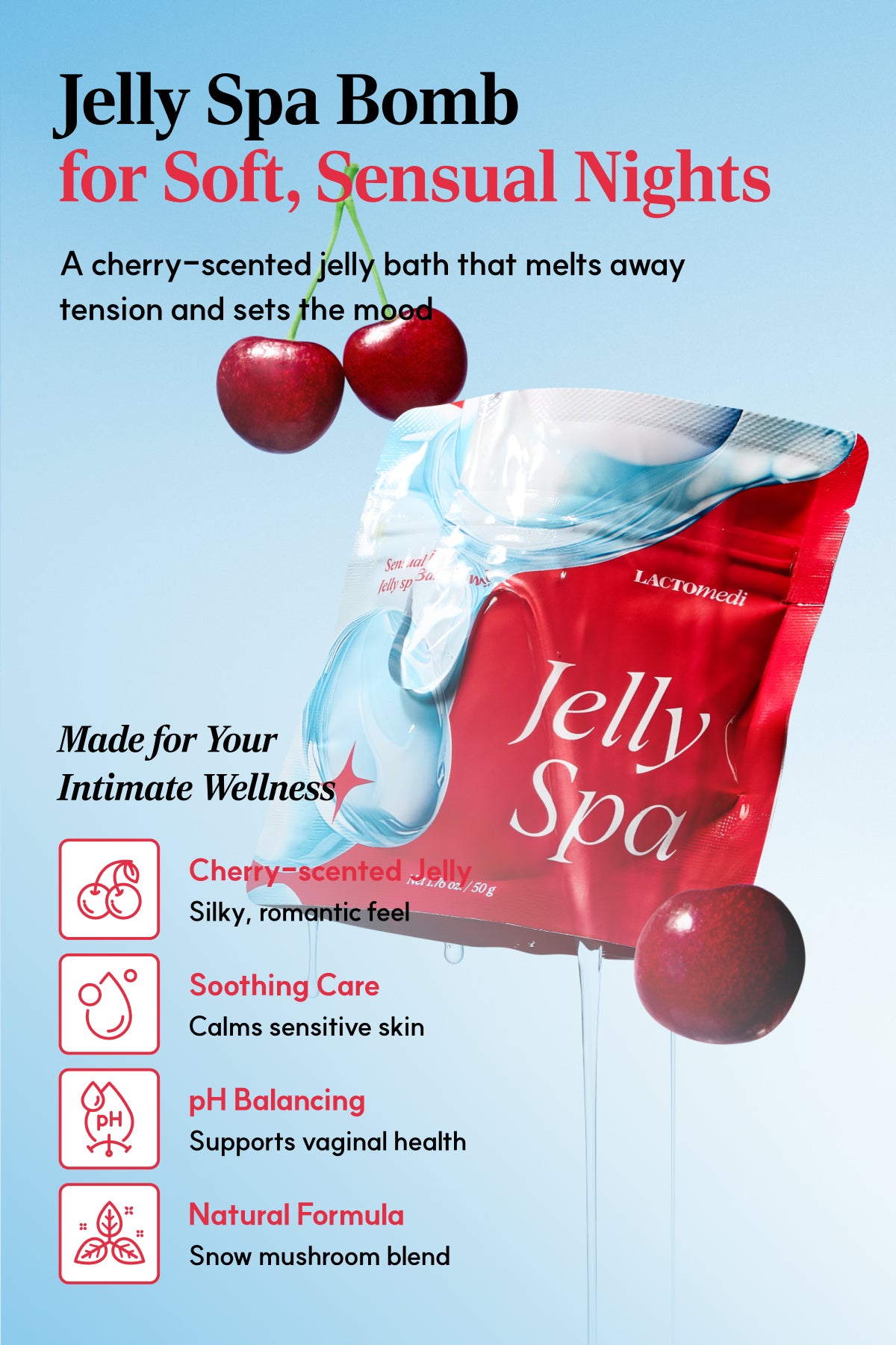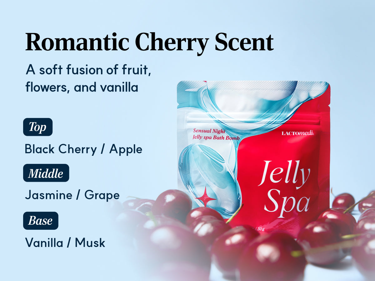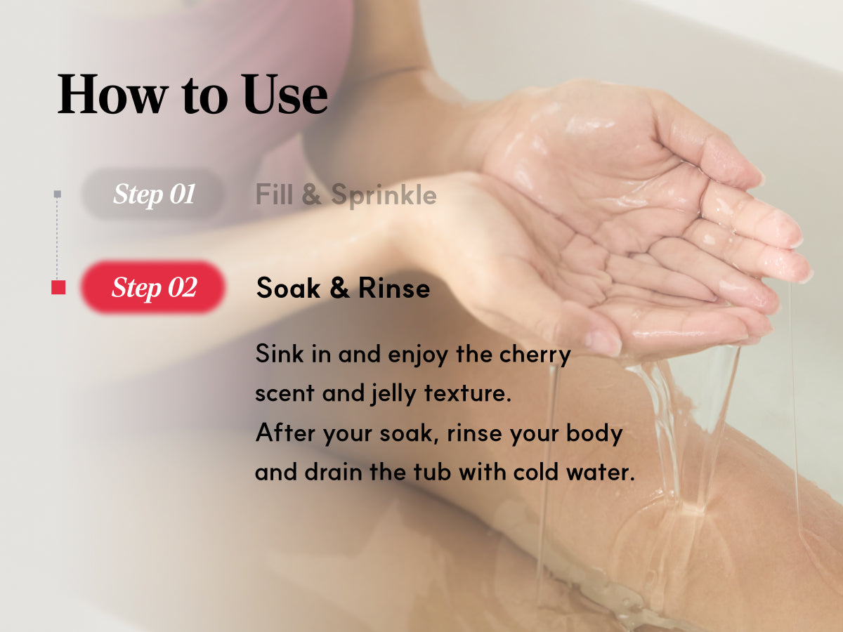 Cherry powder that turns water into a soothing jelly bath for self-care or romance.