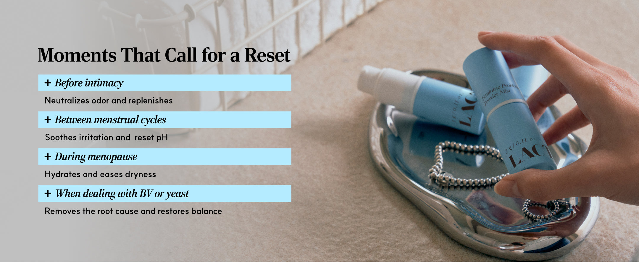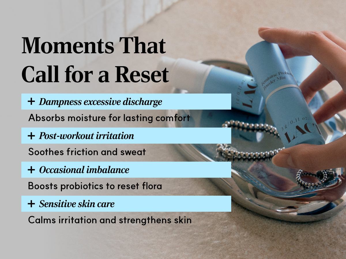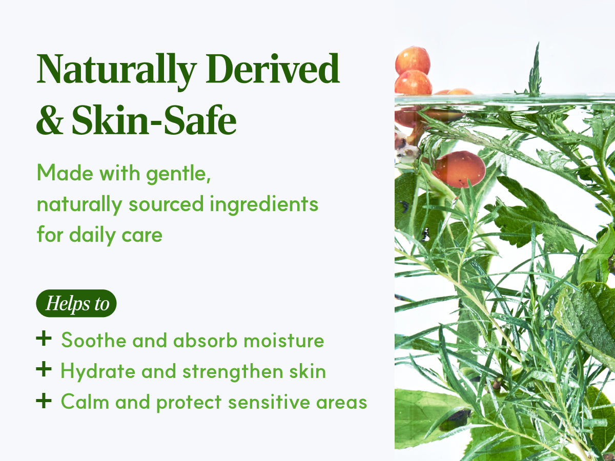 Highly concentrated pre + probiotic powder mist for moisture control and natural balance.