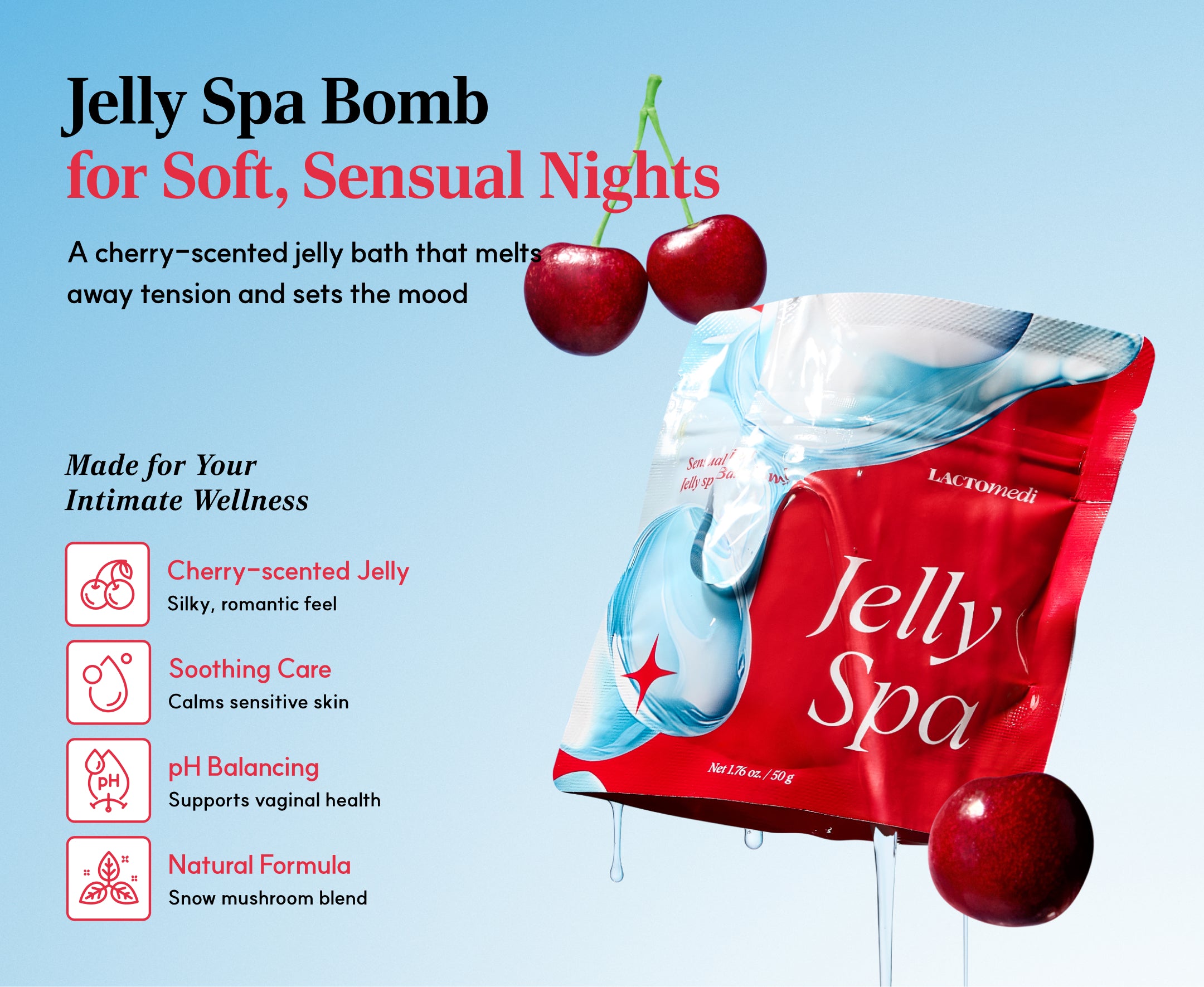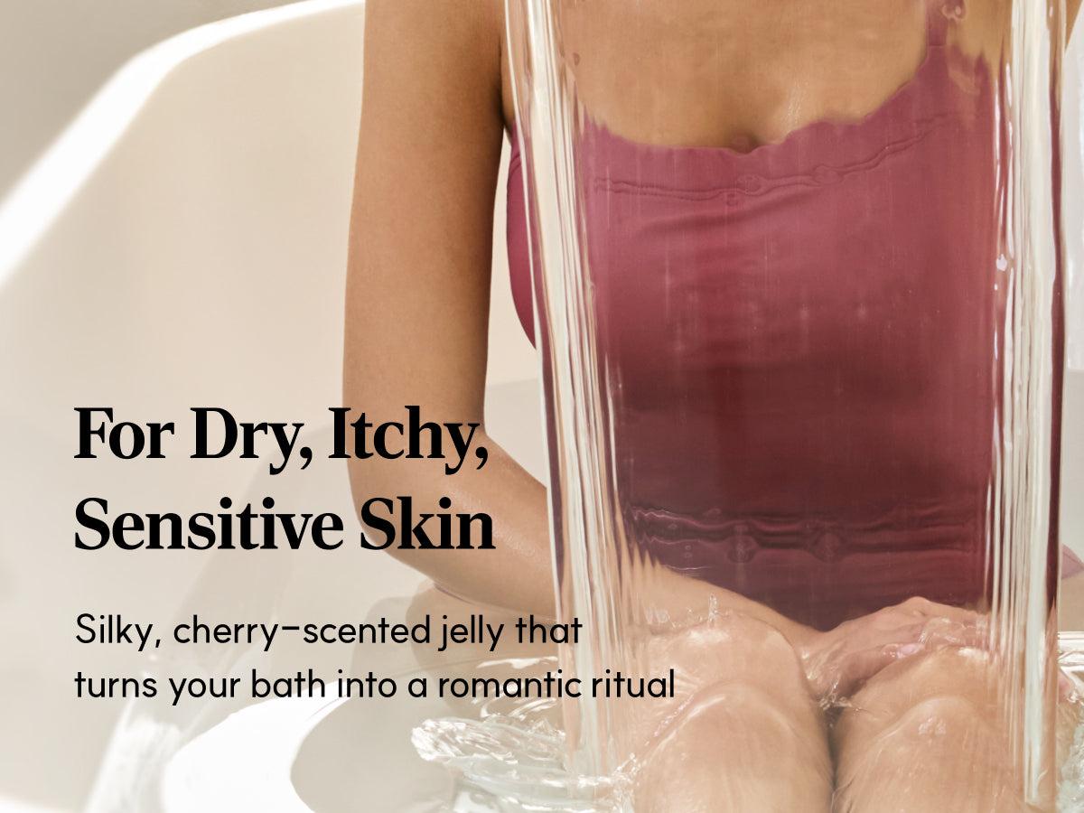 Cherry powder that turns water into a soothing jelly bath for self-care or romance.